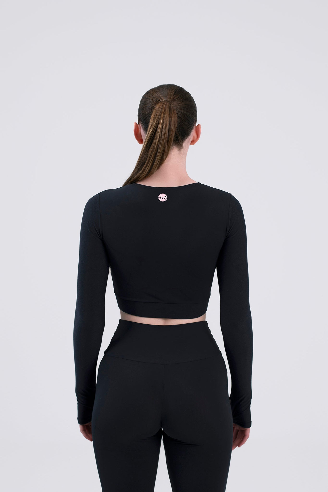 Top with an asymmetrical front cut-out, sleeves and waistband in thin brushed fabric. Features thumbholes in the sleeves and a logo on the back.