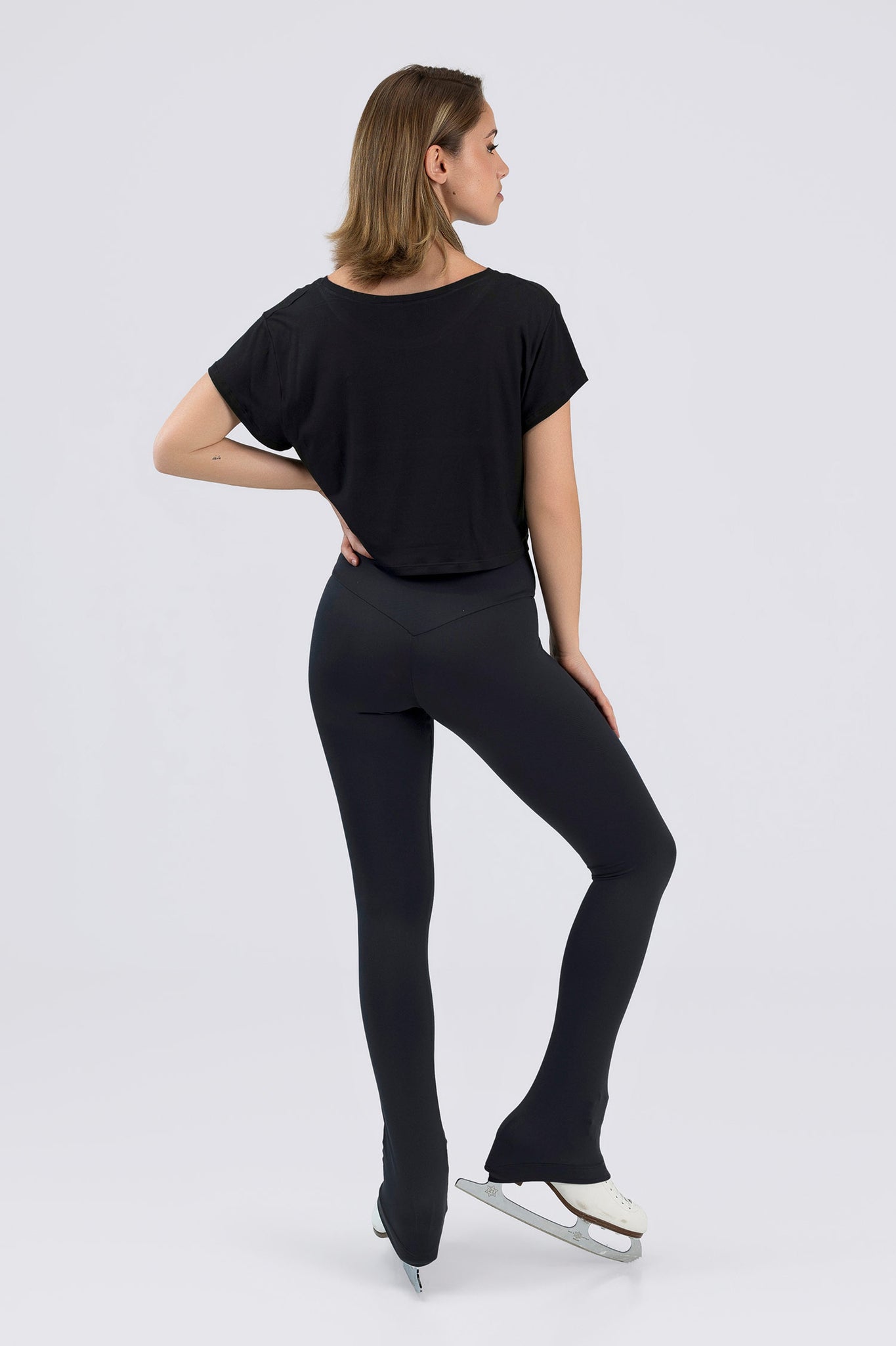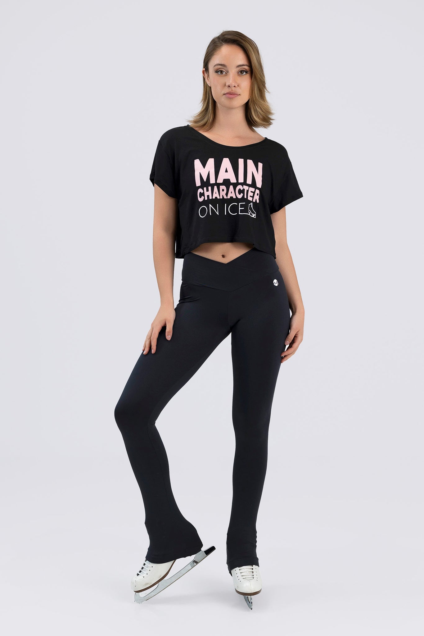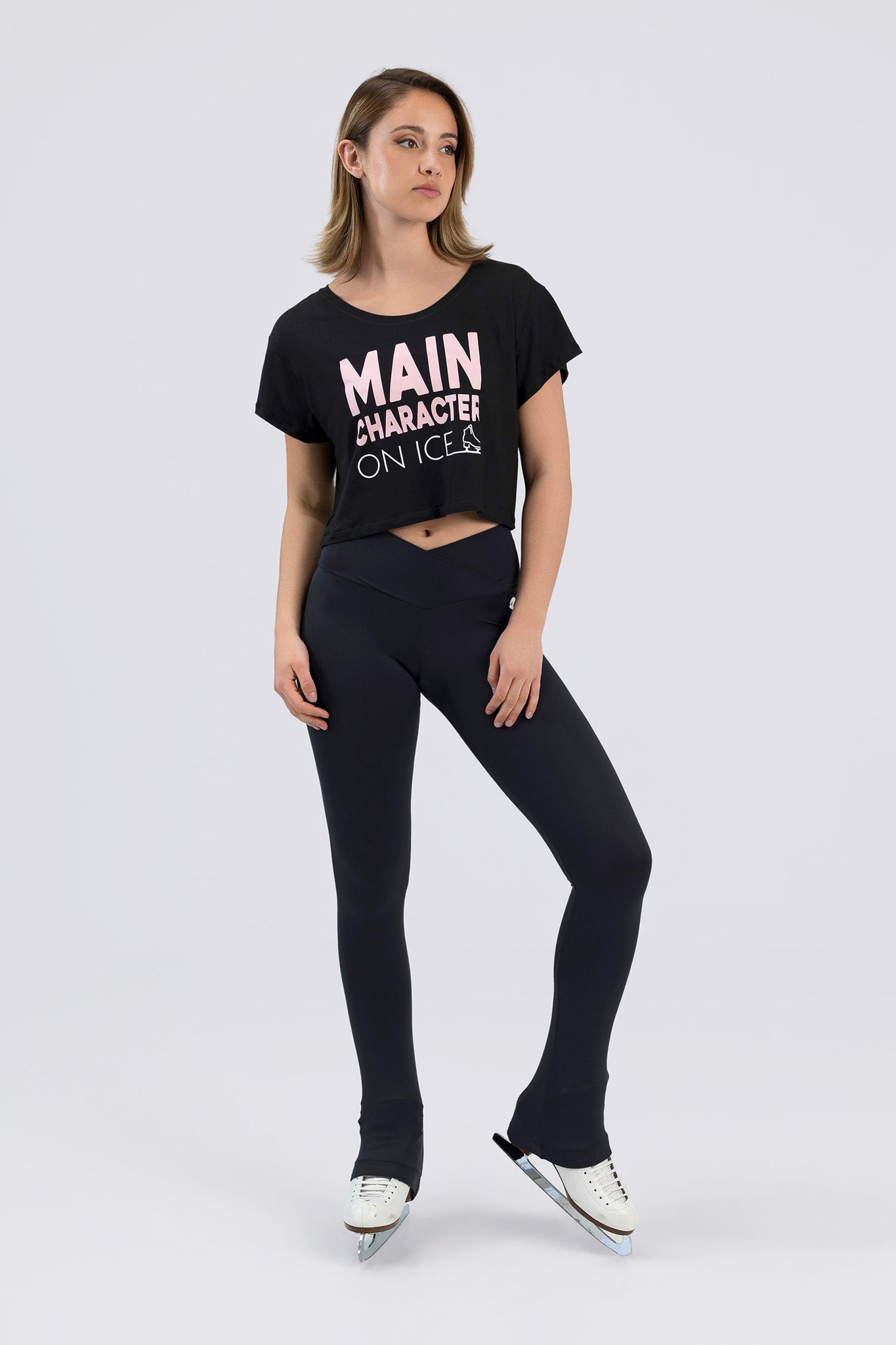 Short-sleeve crop top with “Main Character on Ice” print in pink and ice skate graphic.