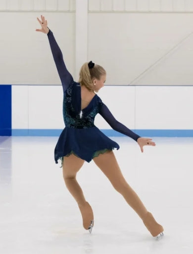Indigo blue velvet dress with long mesh sleeves and gathered mesh along the V- neck and down the back. The layered skirt of navy georgette over emerald linen chiffon adds a hint of extra colour.